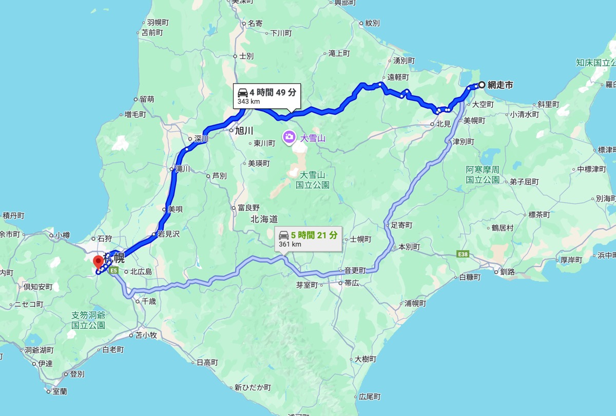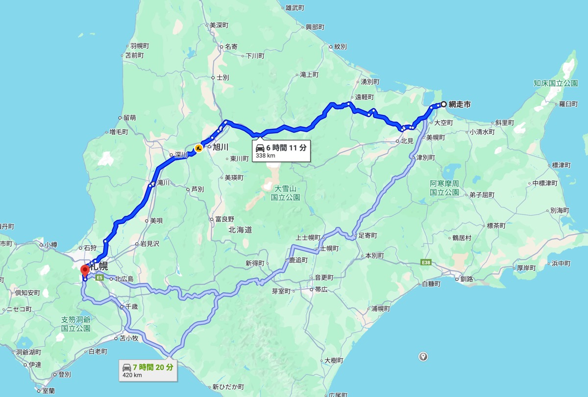 国道39号 → 北見方面 → 道東自動車道 → 千歳恵庭JCT → 道央自動車道 → 札幌南ICへ。
