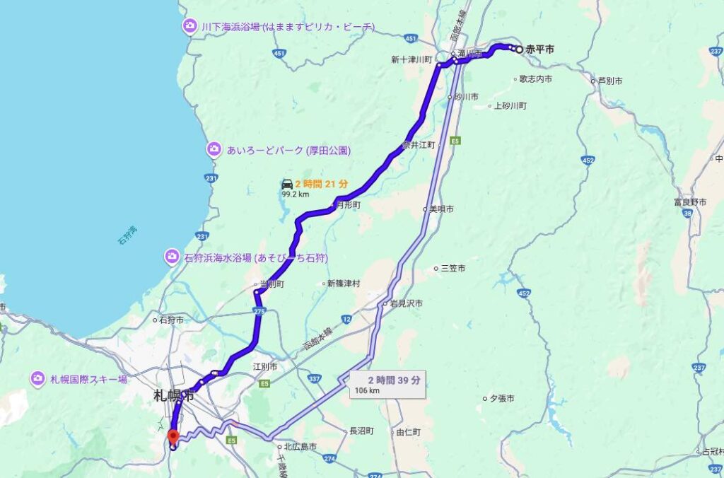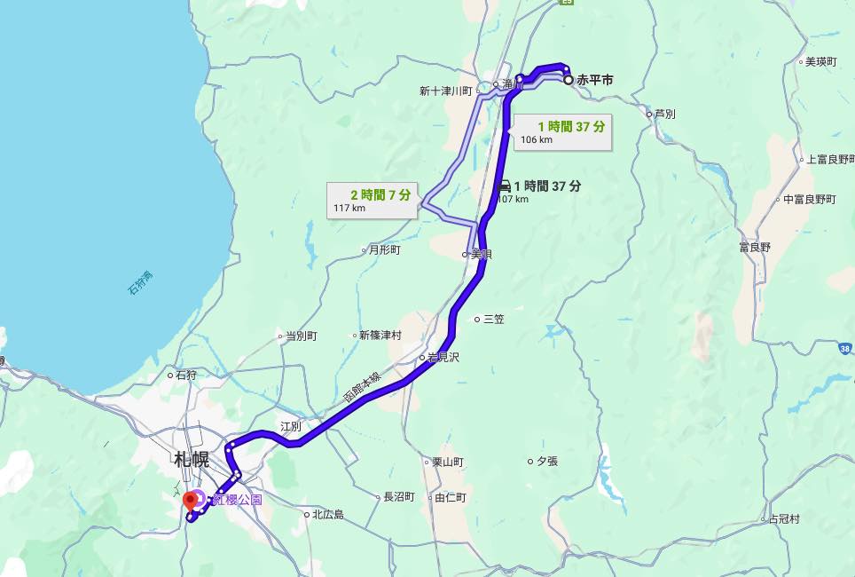 赤平市中心部から車で約2時間前後。