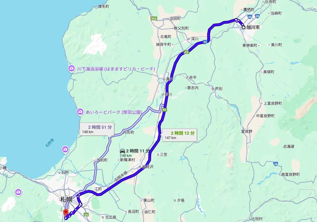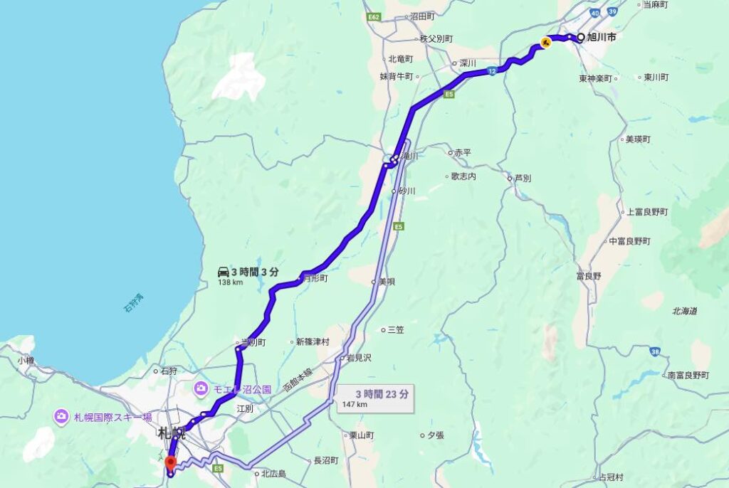永山・春光方面 | 約2時間50分 | 国道12号を南下し、滝川・岩見沢を経由して札幌へ。 環状通を南下し、平岸通から真駒内方面へ。 |