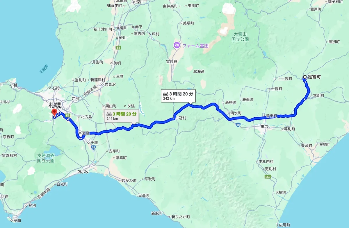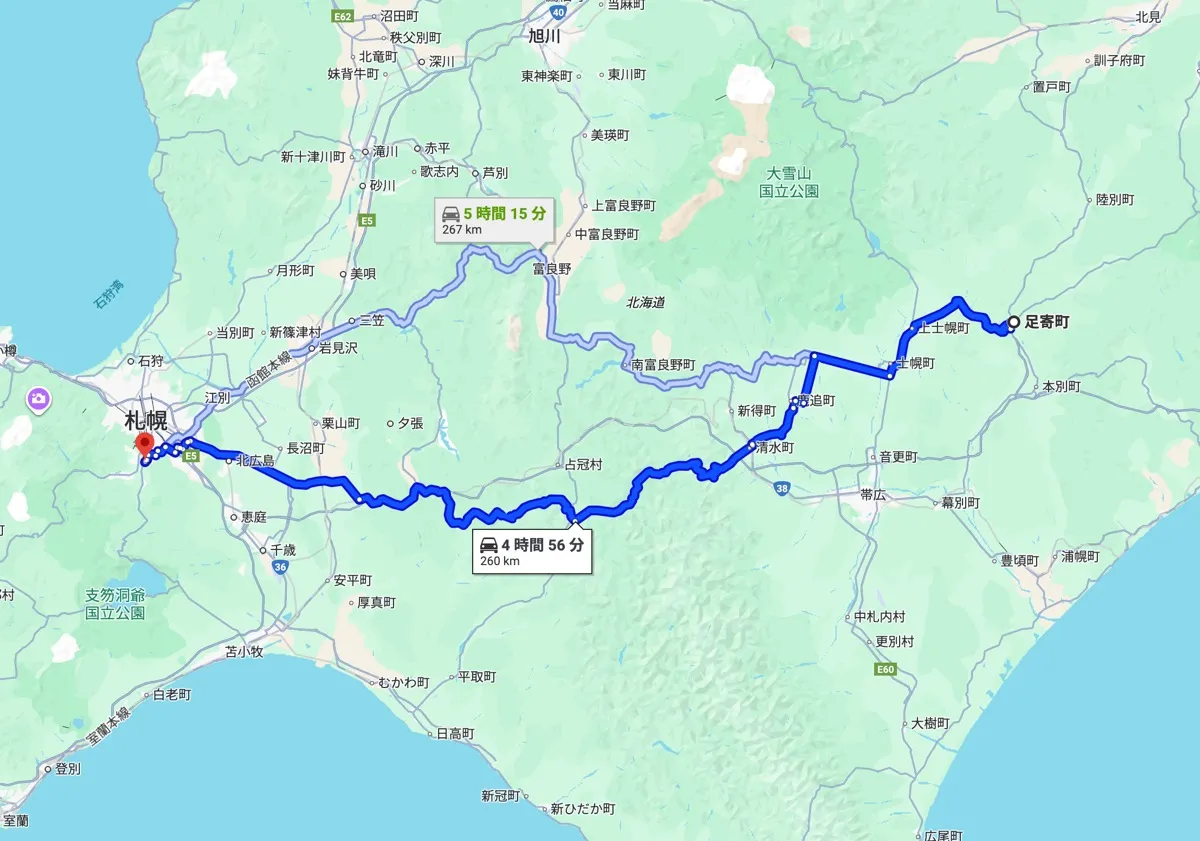 足寄ICから道東自動車道 → 千歳恵庭JCT → 道央自動車道 → 札幌南ICへ。