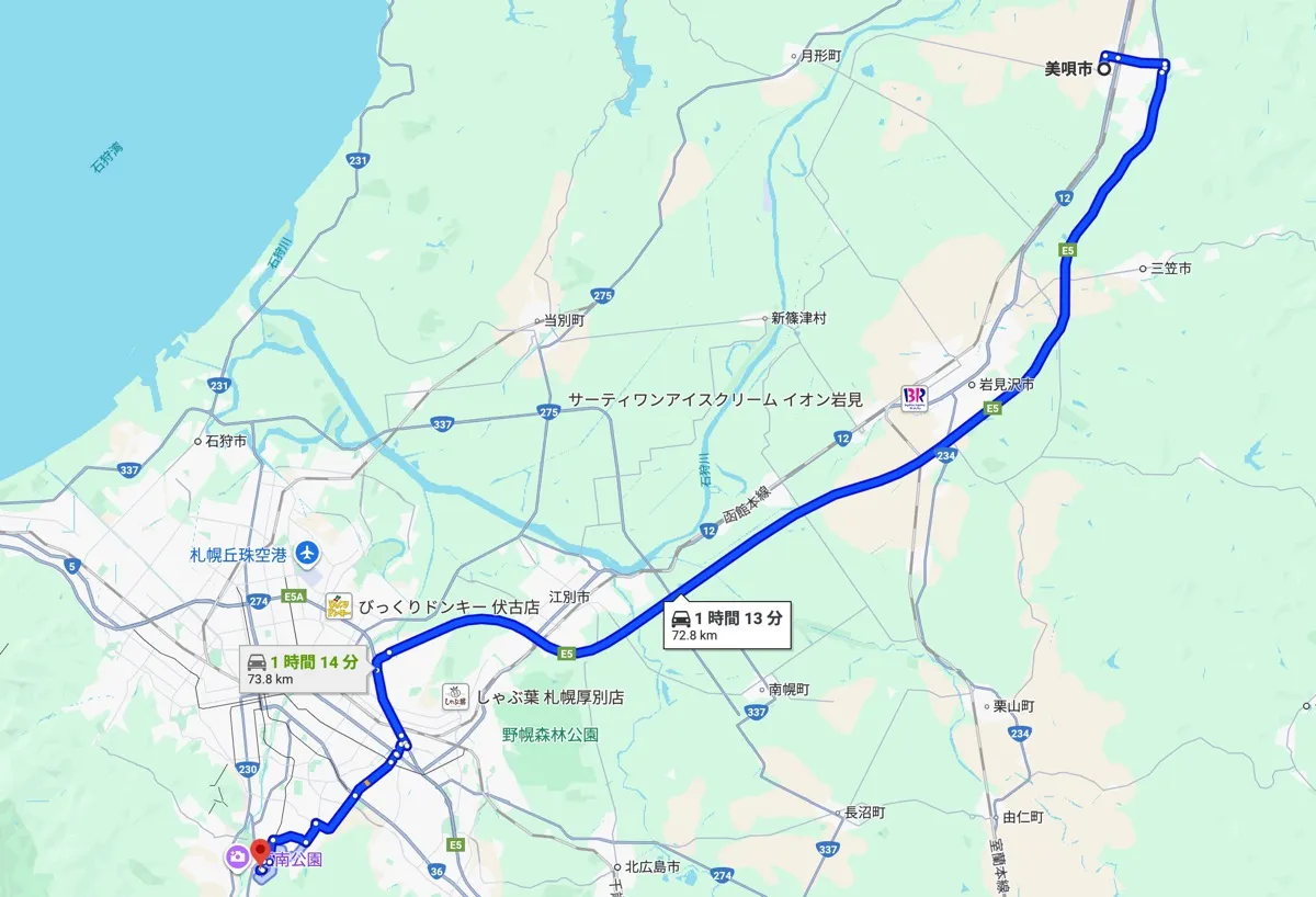 国道12号で美唄ICへ → 道央自動車道:美唄IC → 札幌南IC。
