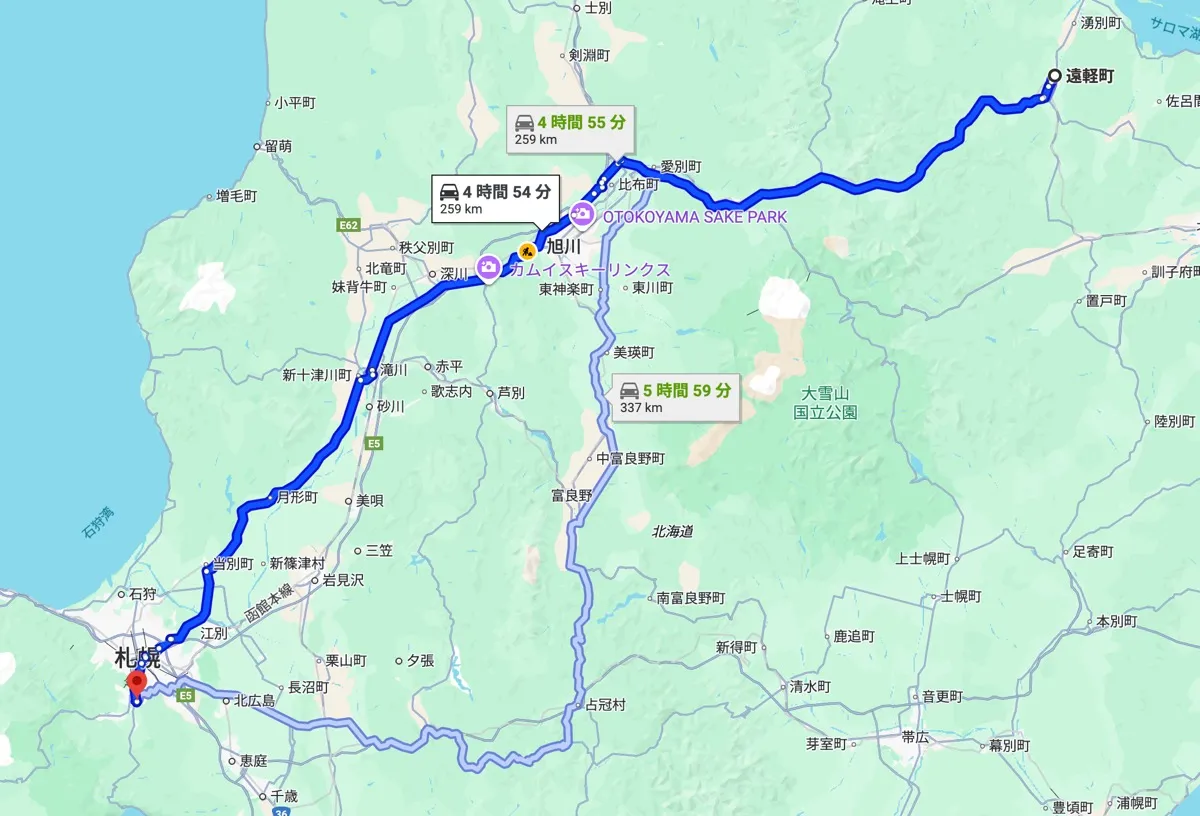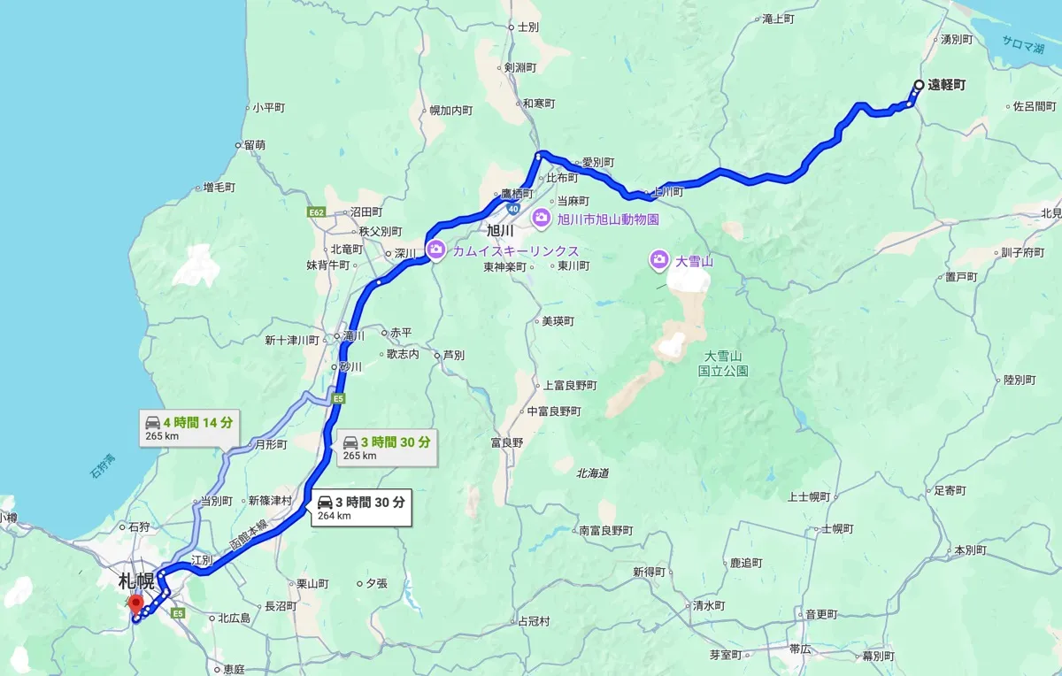 国道242号・道東自動車道経由でおよそ5時間〜5時間半ほどでお越しいただけます。