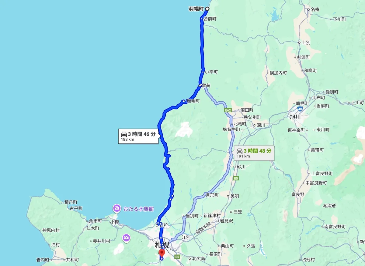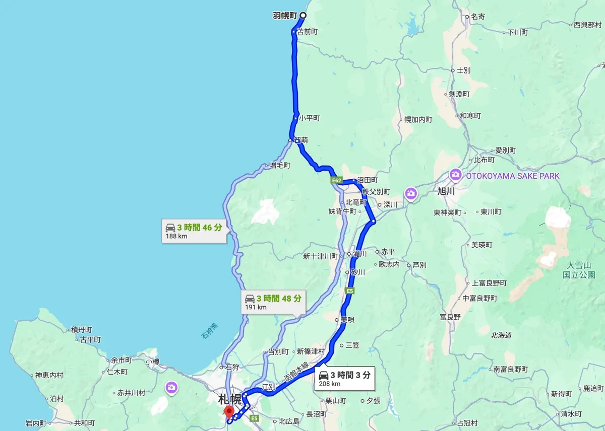 国道232号で留萌方面 → 深川留萌自動車道(留萌大和田IC→深川JCT) → 道央自動車道(深川JCT→札幌南IC)経由でおよそ3時間30分〜4時間が目安です(天候・道路状況により変動)。