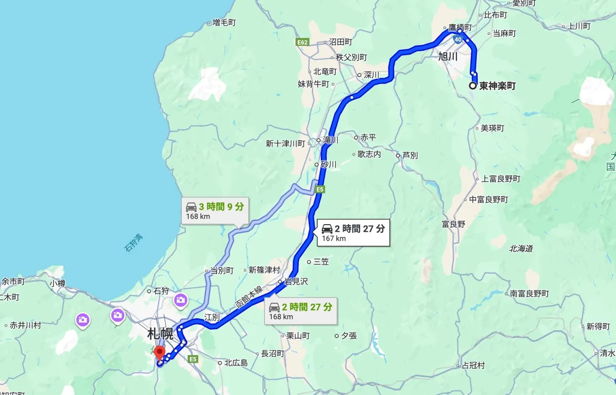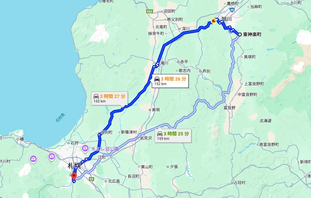 国道237号で旭川方面へ南下し、道央自動車道「旭川鷹栖IC」から札幌南ICへ。