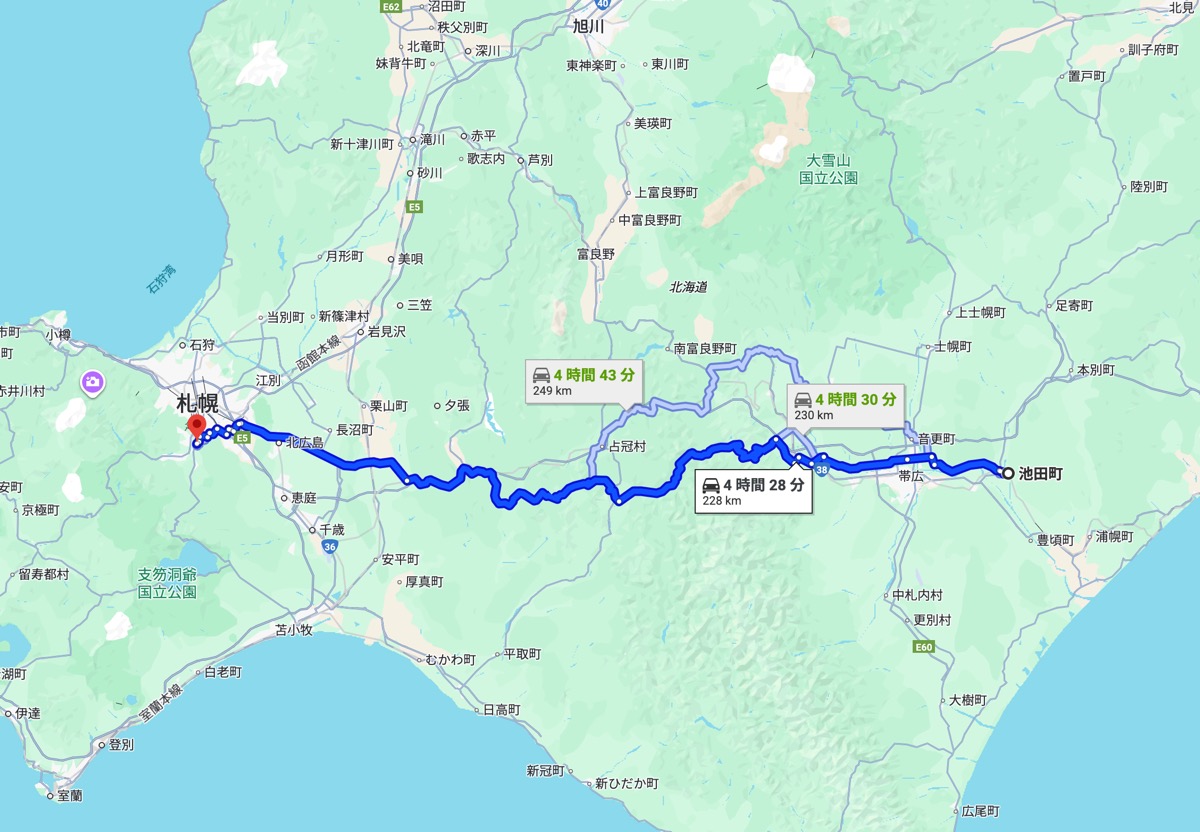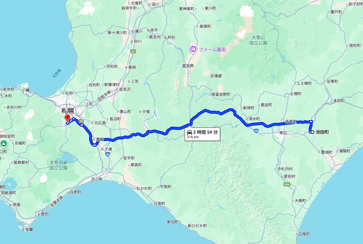 道東自動車道「池田IC」から千歳恵庭JCT → 道央自動車道 → 札幌南ICへ。