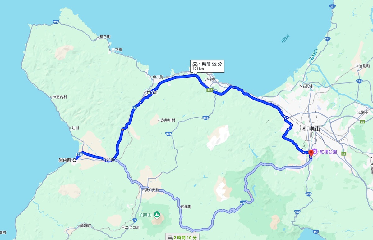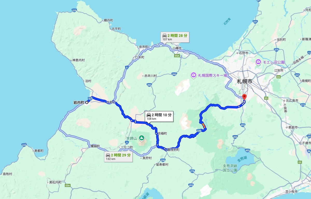 国道229号・国道5号・札樽自動車道経由でおよそ2時間半〜3時間ほどでお越しいただけます。