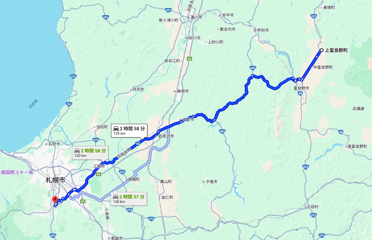 国道237号で富良野市へ → 国道38号で滝川方面 → 滝川IC → 道央自動車道 → 札幌南IC。