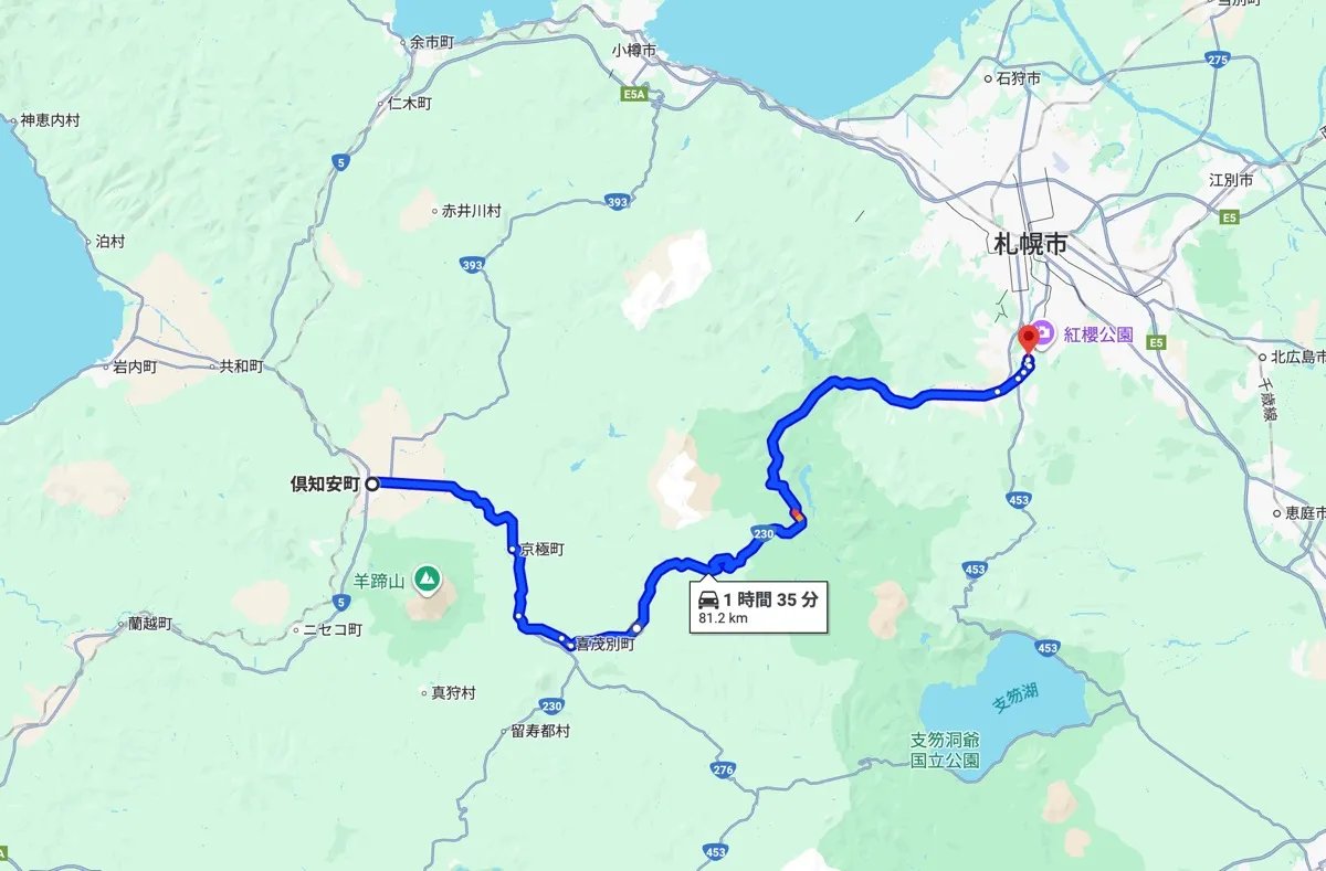 倶知安町中心部から車で約2時間〜2時間半。