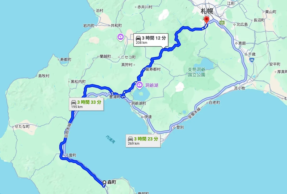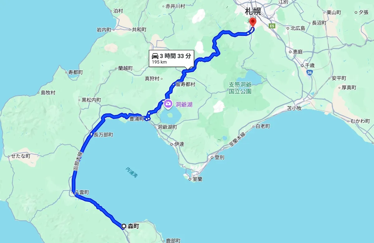 国道5号で森IC方面へ進み、道央自動車道「森IC」→札幌南IC。