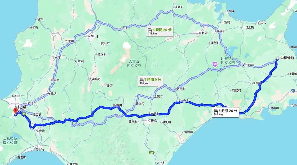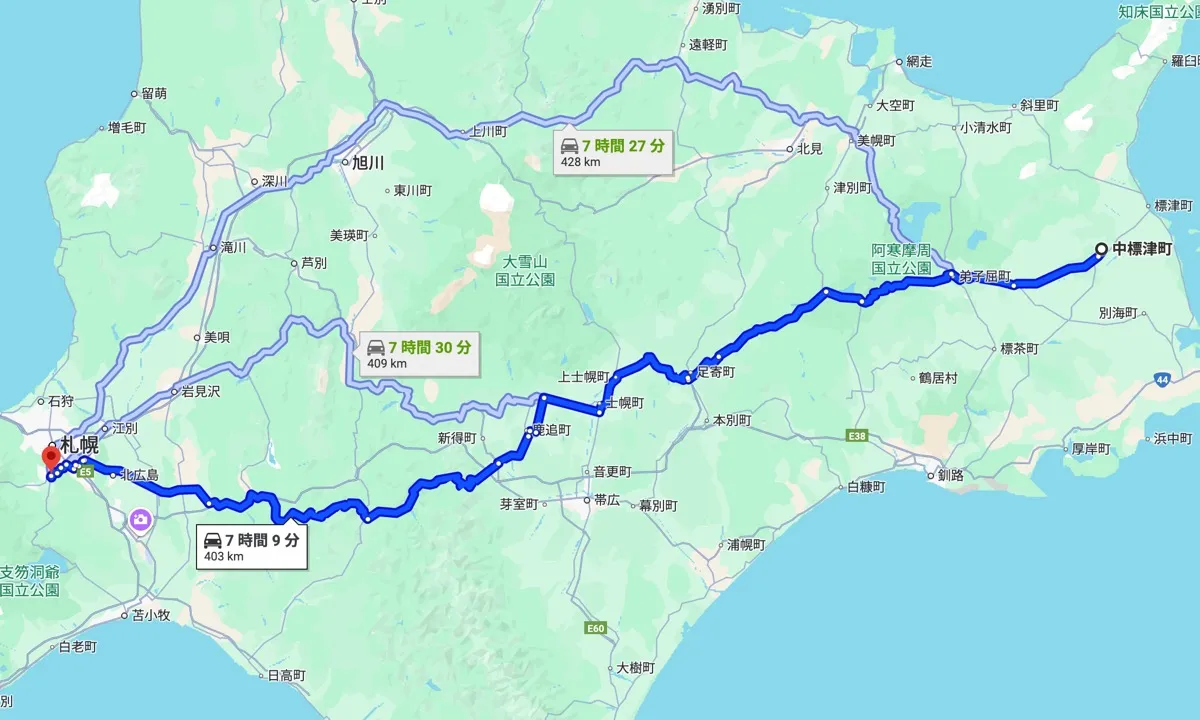 国道272号 → 釧路方面 → 国道38号 → 道東自動車道 → 千歳恵庭JCT → 道央自動車道 → 札幌南ICへ。