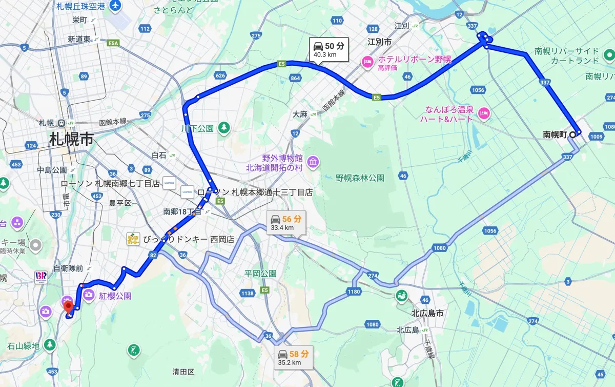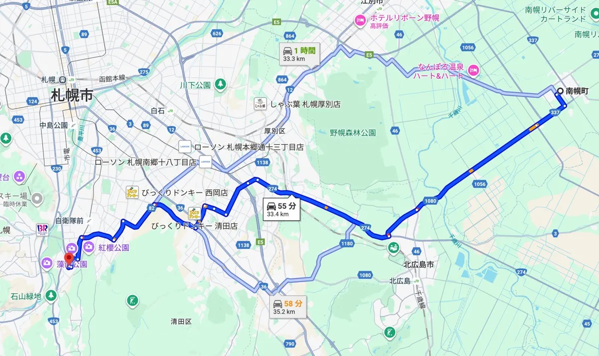 南幌町中心部から車で約1時間10分〜1時間30分。