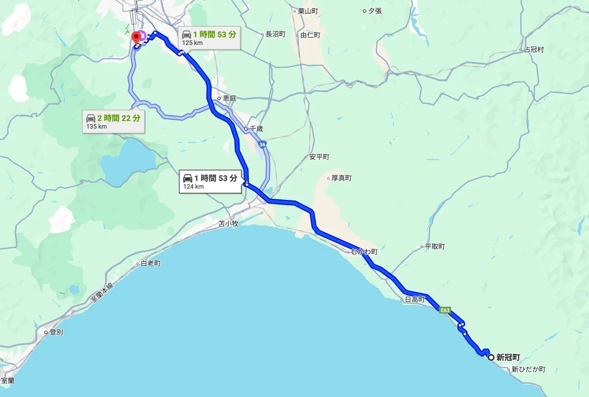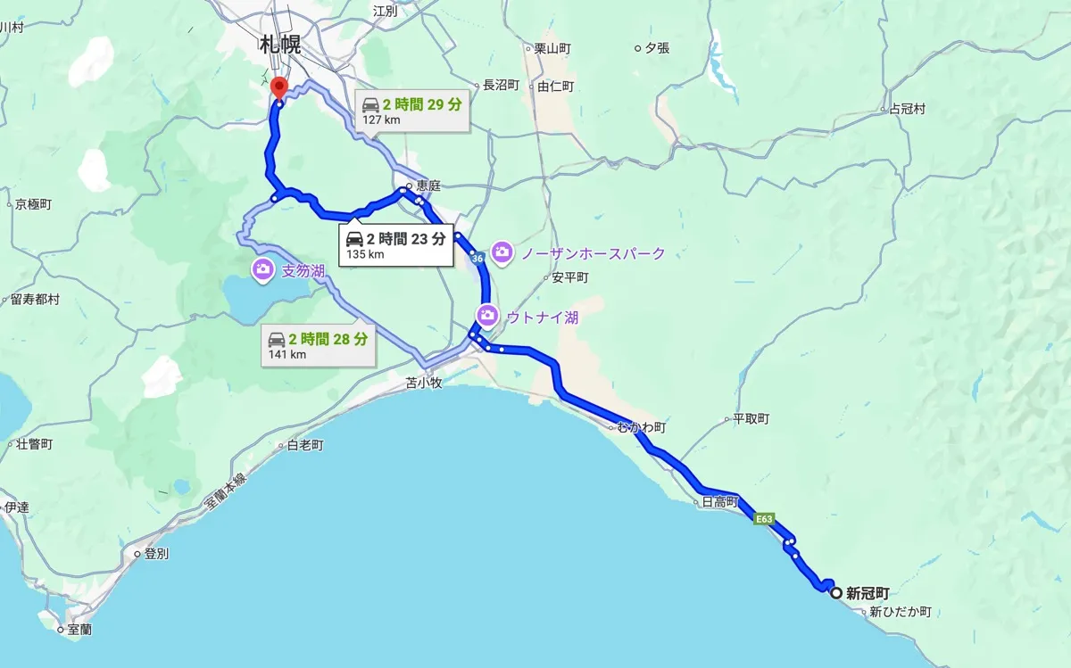 国道235号を苫小牧方面へ進み、日高自動車道 → 道央自動車道を経由して札幌南ICへ。