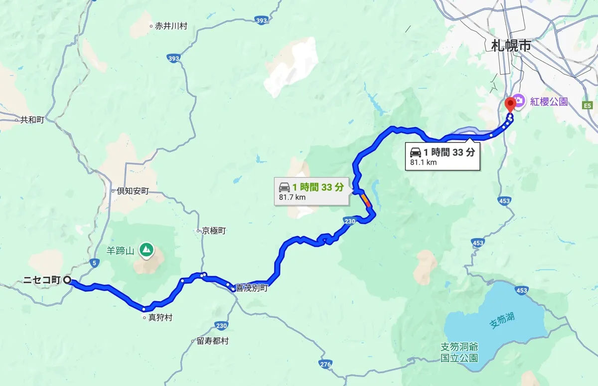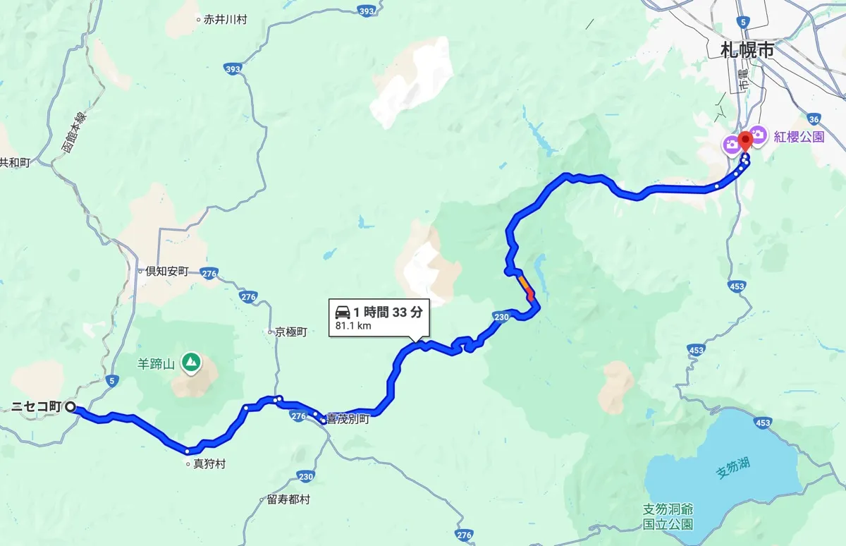 ニセコ町中心部から車で約2時間〜2時間半。