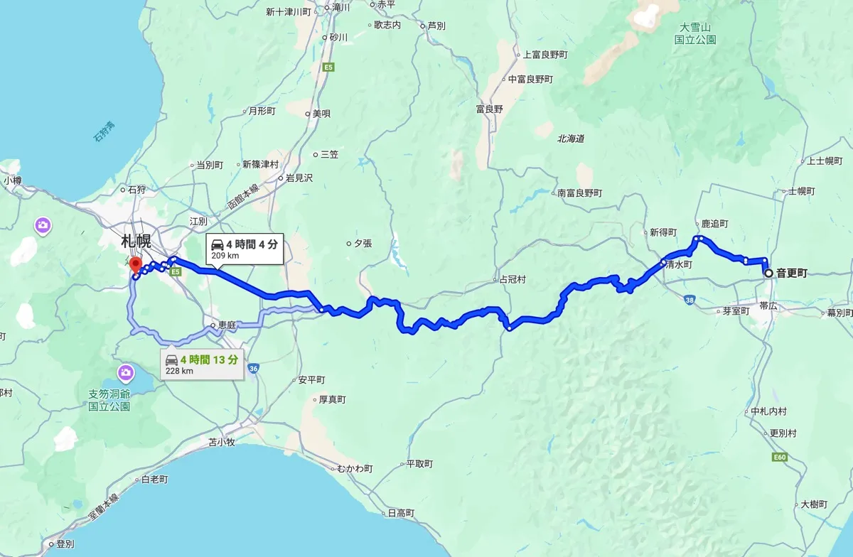 道東自動車道(音更帯広IC→札幌南IC)経由でおよそ3時間30分〜4時間が目安です(天候・道路状況により変動)。