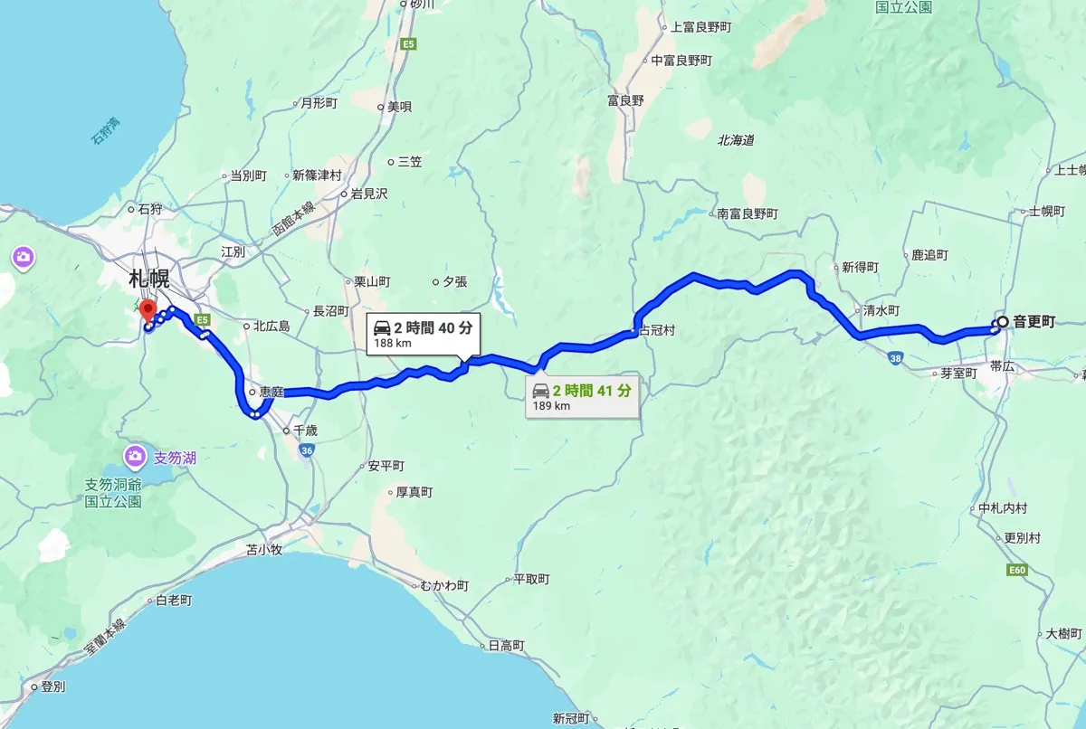音更帯広IC → 道東自動車道 → 札幌南IC。