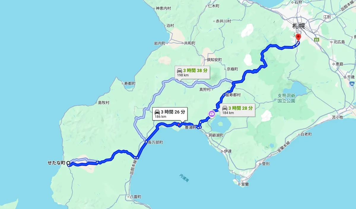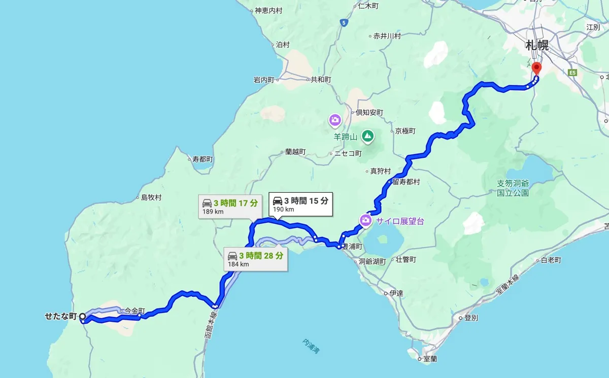 国道229号で黒松内方面へ向かい、黒松内JCTから道央自動車道で札幌南ICまで。