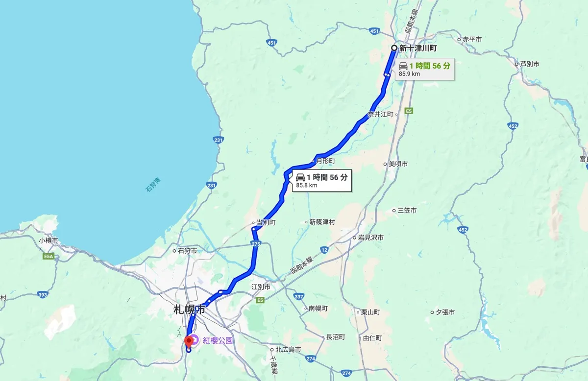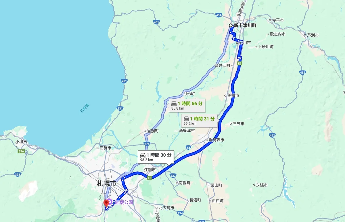 国道451号・国道12号で滝川ICへ → 道央自動車道(滝川IC→札幌南IC)経由でおよそ2時間〜2時間15分が目安です(天候・道路状況により変動)。