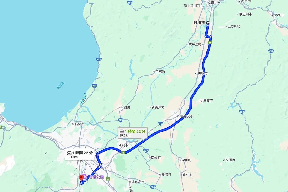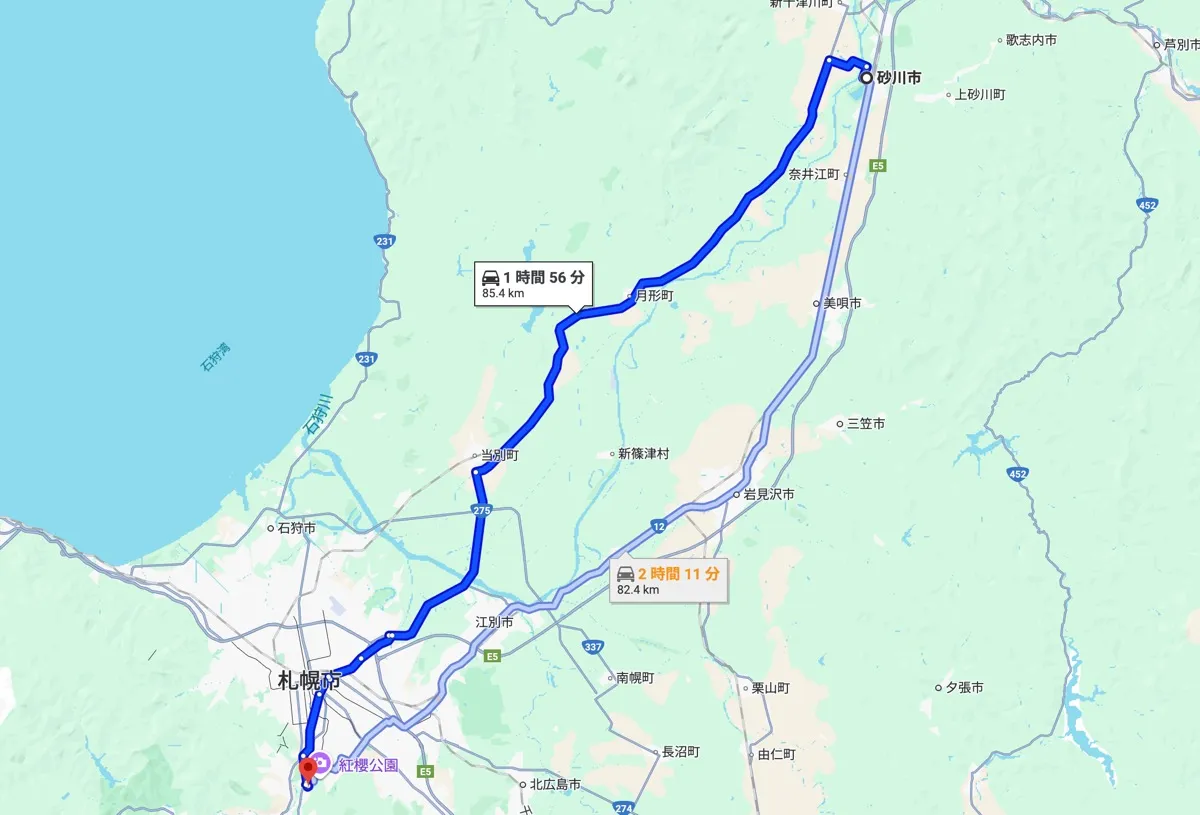 国道12号で砂川IC(または砂川SAスマートIC)へ → 道央自動車道:砂川IC → 札幌南IC。