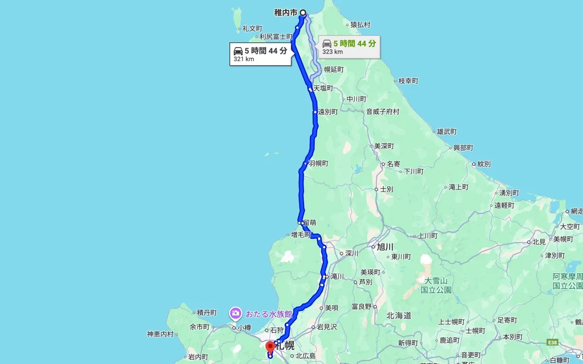 国道40号で旭川方面へ → 道央自動車道(旭川鷹栖IC→札幌南IC)経由でおよそ6時間30分〜7時間30分が目安です(天候・道路状況により大きく変動)。