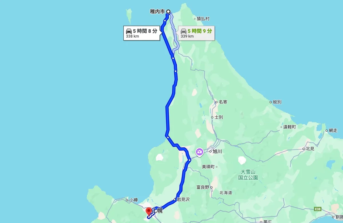 稚内市中心部から車で約6時間30分〜7時間30分。