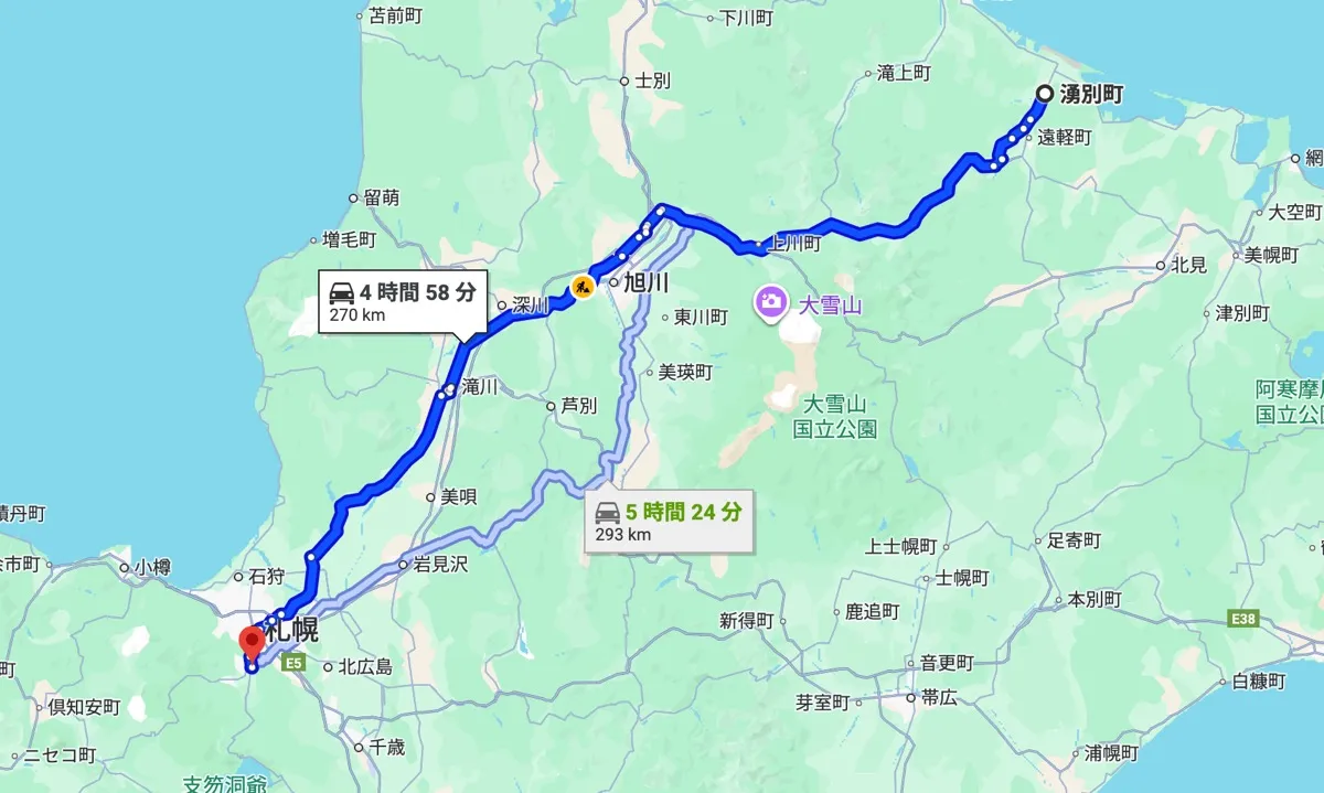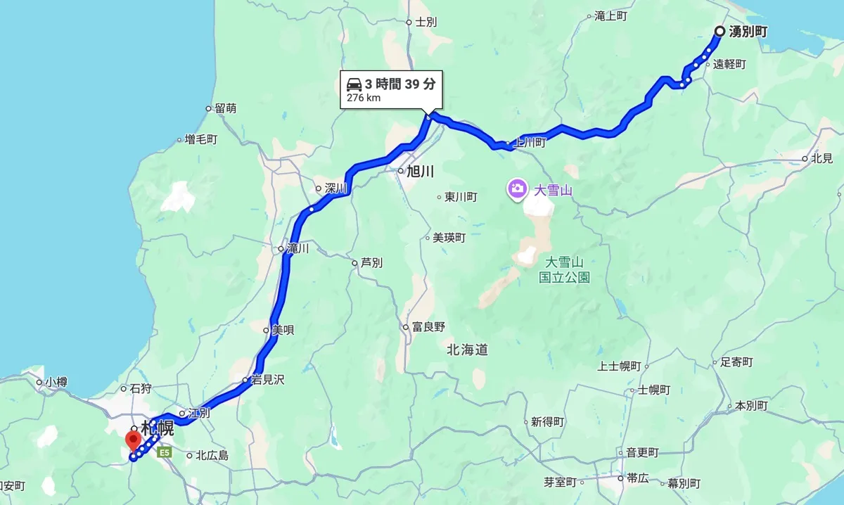 湧別町中心部から車で約5時間半〜6時間。