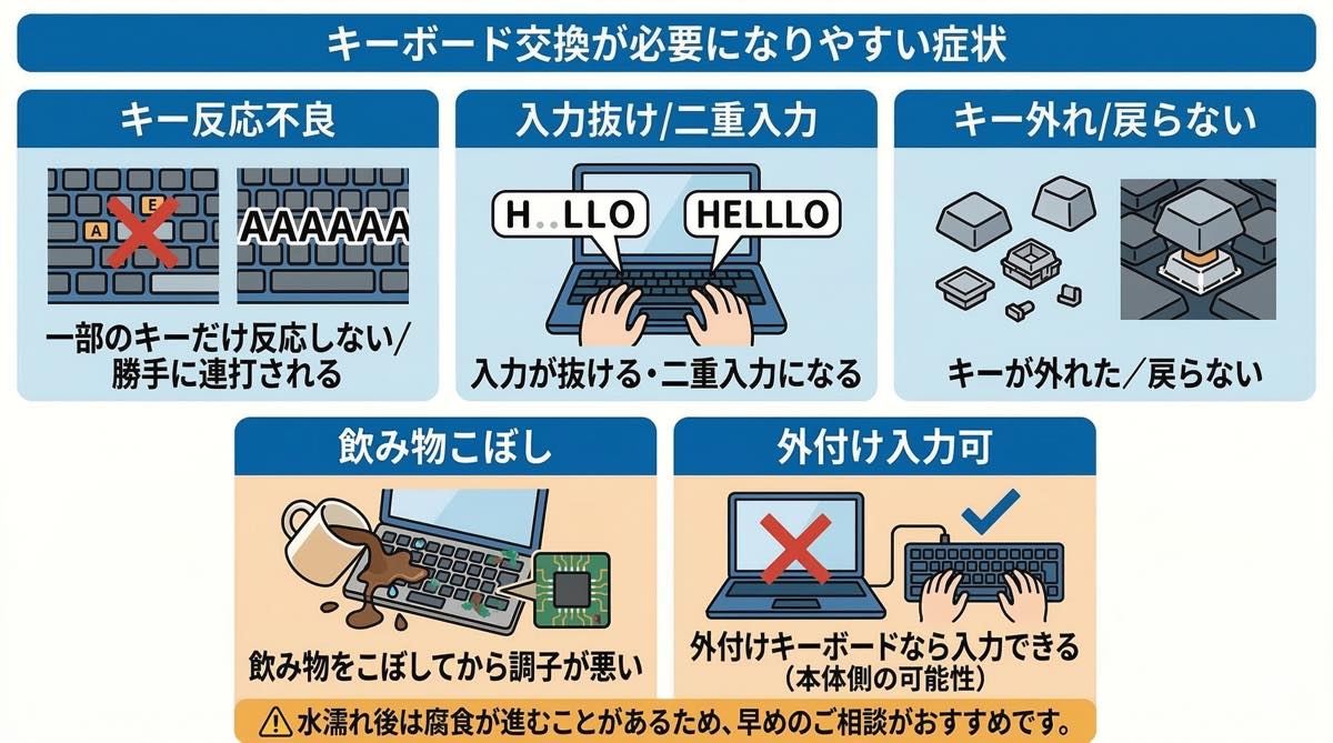 症状や機種により、キーボード交換で改善するケースが多いですが、状態によっては清掃・補修や別部品の交換が必要になる場合もあります。