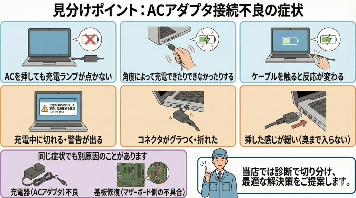 この場合は電源ジャックの故障の可能性もありますが、ACアダプタ側が原因になっているケースもあります。
