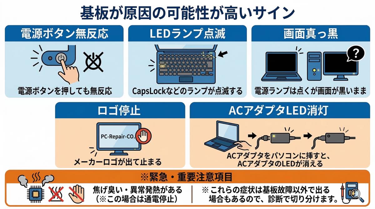 ※これらの症状は基板故障以外で出る場合もあるので、診断で切り分けます。