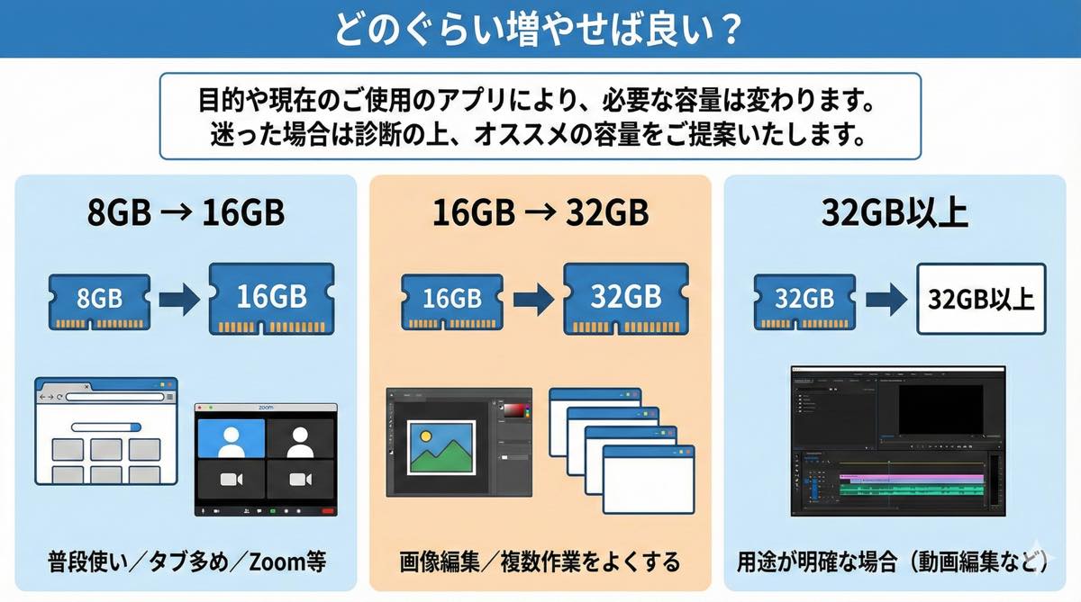 とくに「ブラウザのタブを増やすと急に重い」「複数アプリを同時に使うと固まる」場合は、メモリ増設で改善する可能性があります。