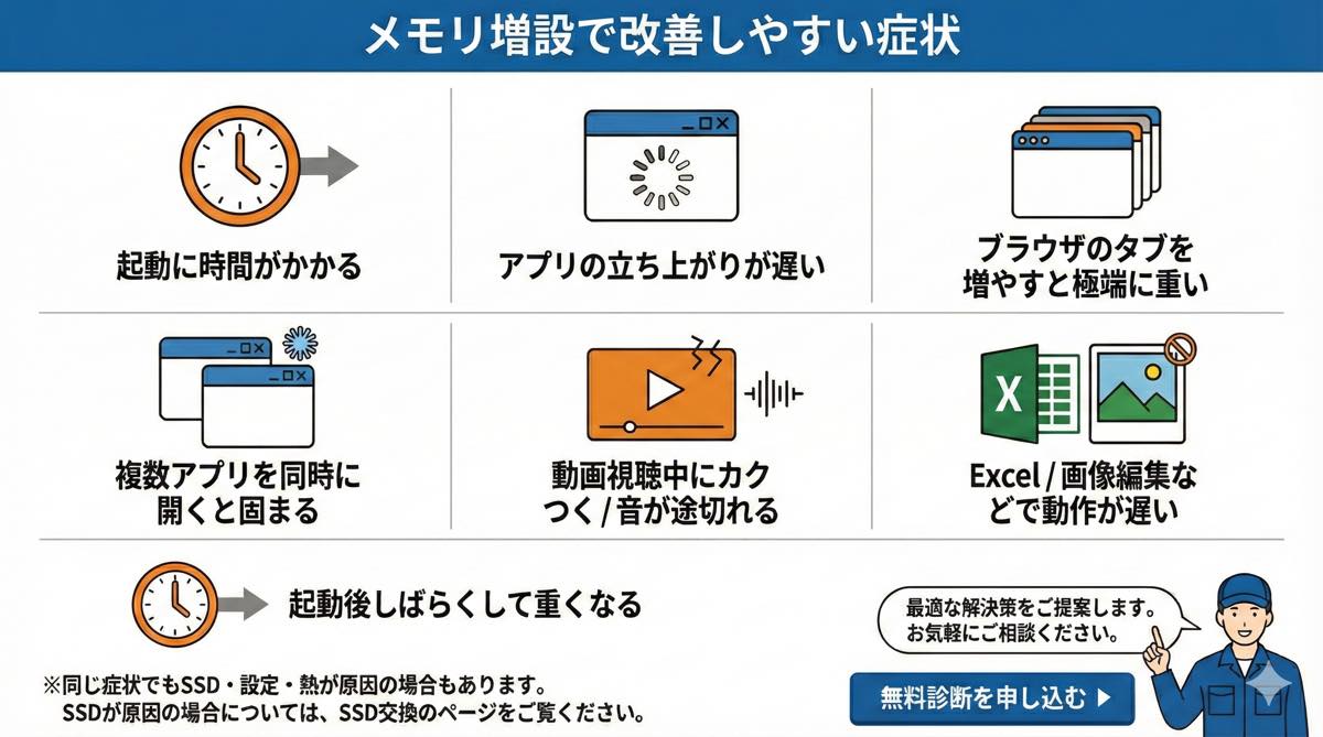 ただし原因は複数あり得るため、診断で状態を確認したうえで、メモリ増設やSSD交換など最適な方法をご案内します。
