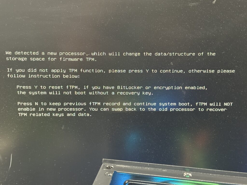 AMDのCPU交換でTPMが変わるということは、BitLockerがもし有効だった場合、起動時に回復キー要求が出る可能性が高いです。