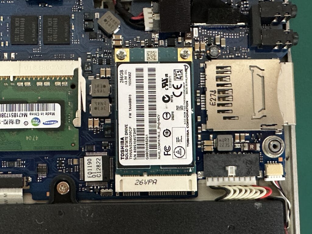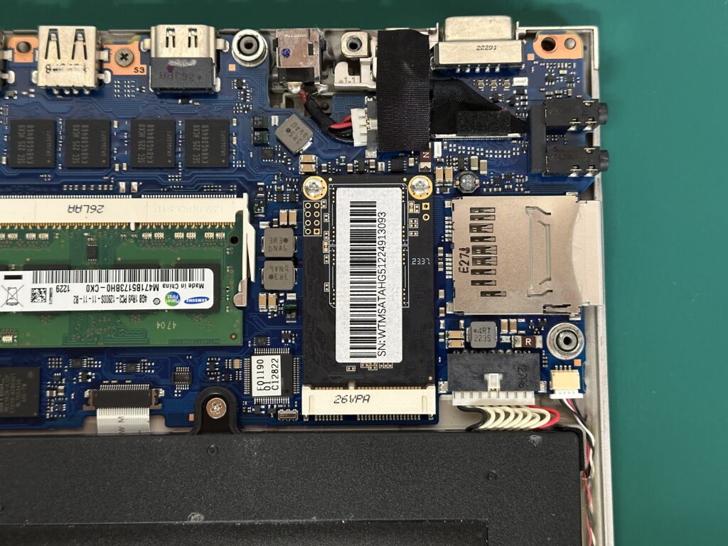 メモリの隣にあるのがSSDです。この当時はmSATAやMicro SATAなど複数の接続規格のある時代でした。